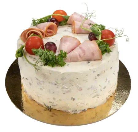 Skinka (fläsk 70 %, vatten, majssirap, salt 1,8 %, stabiliseringsmedel E450, E451, E407, smakförstärkare E621, antioxidant E301, selleri, glukos, konserveringsmedel E250), majonnäs (vegetabilisk olja, vatten, äggula, senapsfrö, vinäger, socker, salt, kryddor, konserveringsmedel E211, E202, stabiliseringsmedel E412, E415, surhetsreglerande medel E260), färsk gurka, gräslöksfärskost (pastöriserad skummjölk* och grädde*, vatten, gräslök 0,4 %, citron, salt, socker, vitpeppar, arom, förtjockningsmedel E410, E440 och surdeg), vindruva, tomat, persilja, salt, svartpeppar, ärtgroddar