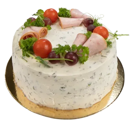 En läcker skinksmörgåstårta med vacker, delikat dekoration.