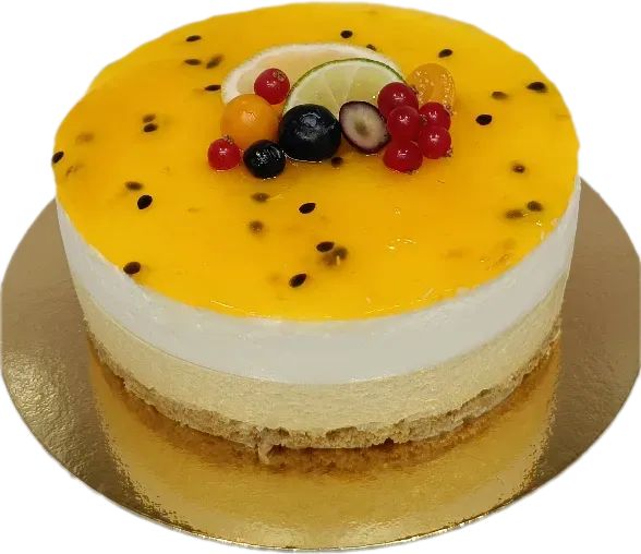 En fräsch och solig kaka som härligt kombinerar vanilj, passionsfrukt och persika.